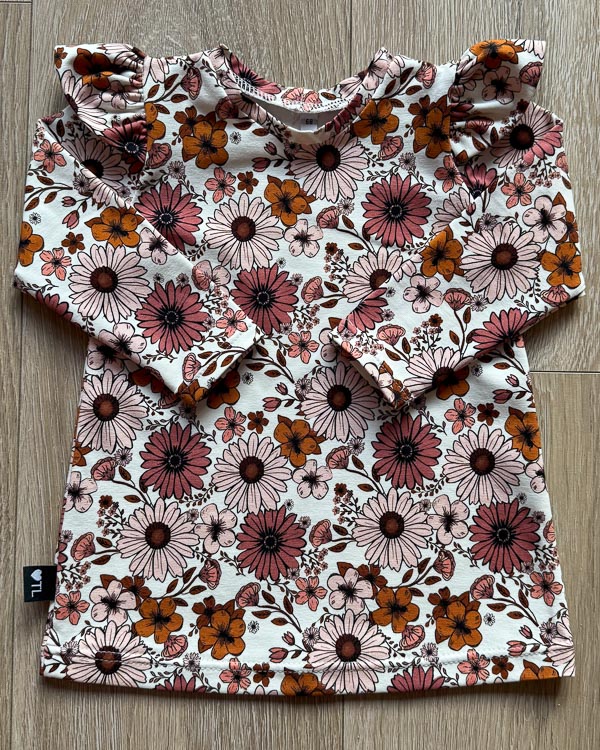 Handgemaakt jurkje in de stof autumn flowers. Deze stof is bedrukt met diverse gekleurde bloemen. Deze stof heeft een off white achtergrond. Ideaal te combineren met onze cognac, donkerbruin en de roze kleuren.