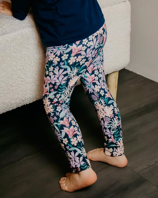 Handgemaakte legging in de stof digital flowers navy. Dit is een stof bedrukt met diverse gekleurde bloemen. Deze stof heeft een donkerblauwe achtergrond. Ideaal te combineren met onze roze, burgundy en sand kleuren.