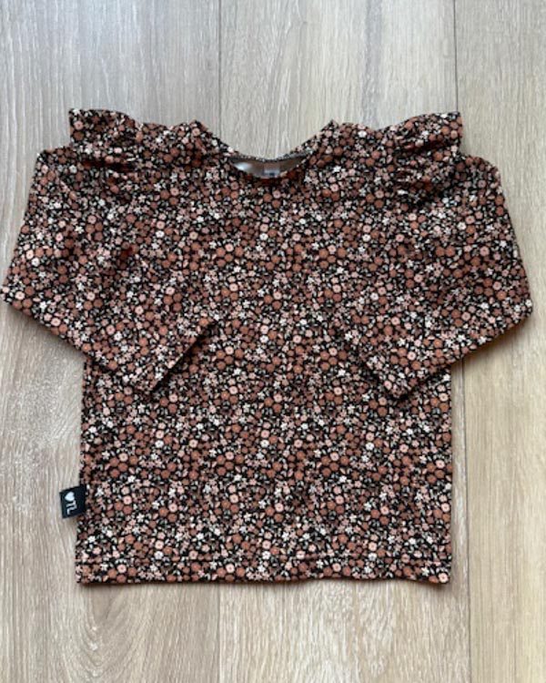 Handgemaakte longsleeve in de stof winterbloemen donkerbruin. Deze stof is bedrukt met diverse gekleurde bloemen. Deze stof heeft een donkerbruine achtergrond. Ideaal te combineren met onze cognac en donkerbruin en sand kleuren.