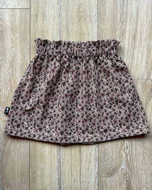 Handgemaakte paperbag skirt in de stof bloemen oud mauve. De paperbag skirt is gemaakt van een zachte en rekbare katoen. Dit zorgt ervoor dat de kleding gemakkelijk aangaat en heerlijk zit. De stof heeft een patroon van bloemen in een oud mauve kleur.